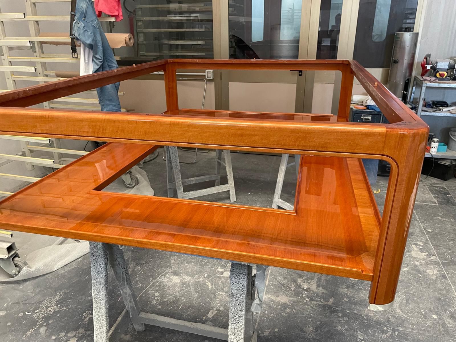Bleached Wood Restoration on Yacht Furniture. The wood used on yachts, often selected for its natural beauty and durability, is subject to bleaching due to improper application of polyester primer, as well as prolonged exposure to UV rays, salt water, and the use of aggressive detergents. Bleaching manifests as discolored or dulled areas, compromising the aesthetics and value of the wood veneer. At our company, we have eliminated the use of polyester and use only epoxy polyurethane primers and acrylics.